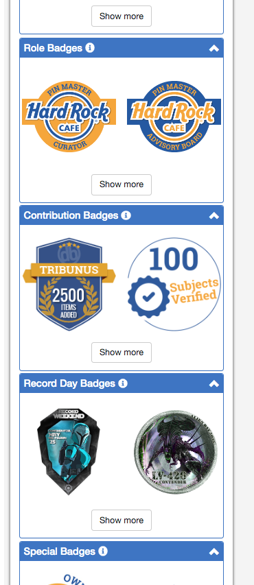Creators can earn these badges by adding items to the database. You can tell that our designer is from Rome (hence the Roman Legion theme...)